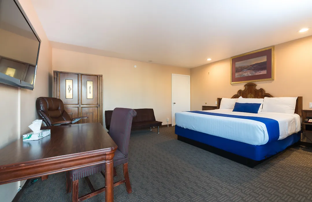 Einige klimatisierte Zimmer im Colony Inn Los Angeles sind mit einem Flachbild-TV ausgestattet und verfügen über ein privates Bad mit einem Haartrockner und einer Dusche. Elegante Möbel sind mit Teppichböden perfekt kombiniert. Einige Badezimmer sind mit einer Badewanne und einer Dusche ausgestattet und verfügen über Toilettenartikel. Die Zimmer blicken zudem auf die Stadt.